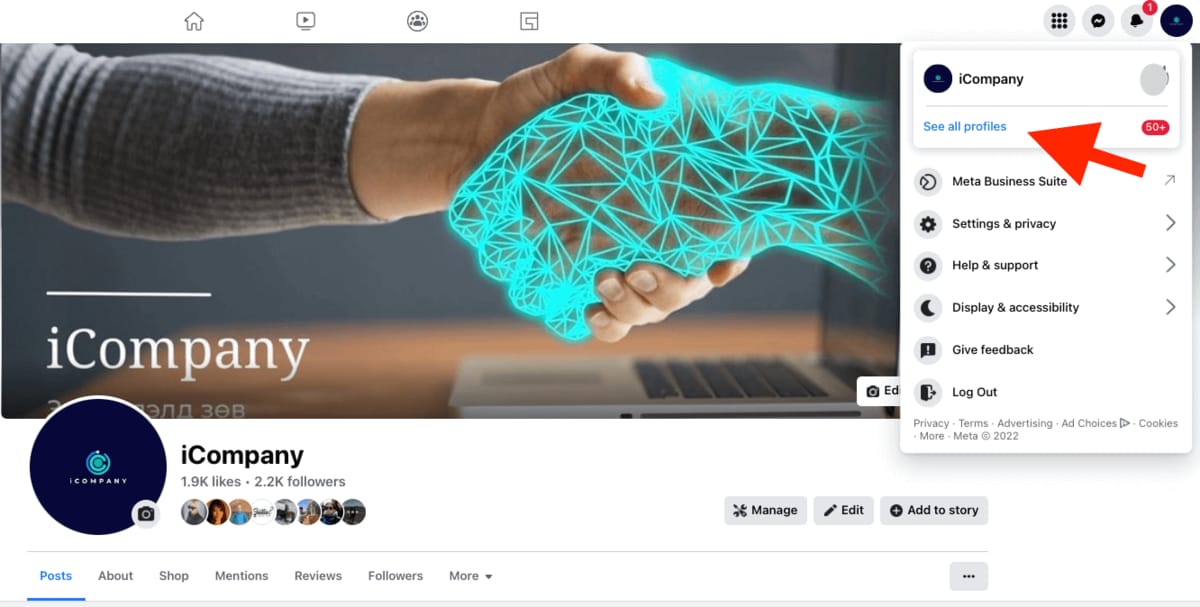 Харин Facebook хуудасны тохиргоо хийх бол хувийн профайлаасаа Facebook хуудас руу шилжих шаардлагатай болсон. Үүний тулд Facebook-ээ нээгээд өөрийн профайл зураг дээр дарж, “See All Profiles” сонголтыг хий. Таны сонгох боломжтой профайл болон хуудаснуудын жагсаалт гарч ирэх бөгөөд эндээс тохиргоо хийх шаардлагатай Facebook хуудсаа сонгоорой. Эсвэл Facebook хуудасны URL хаягаар хандаад шууд “Switch Now” товч дээр дарж болно.