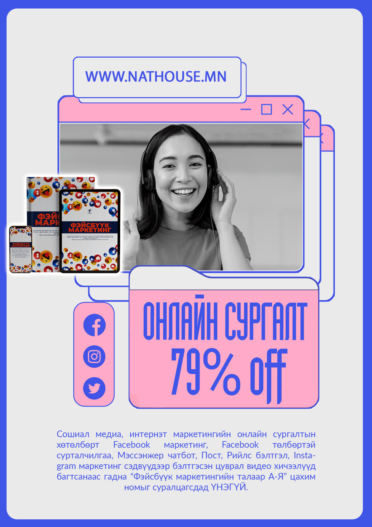 Сошиал медиа, интернэт маркетингийн онлайн сургалтын хөтөлбөрт Facebook маркетинг, Facebook бүүст-төлбөртэй сурталчилгаа, Мэссэнжер чатбот, Пост, Рийлс бэлтгэл, Instagram маркетинг сэдвүүдээр бэлтгэсэн цуврал видео хичээлүүдийг 6 сарын хугацаанд үзэх боломжтой.