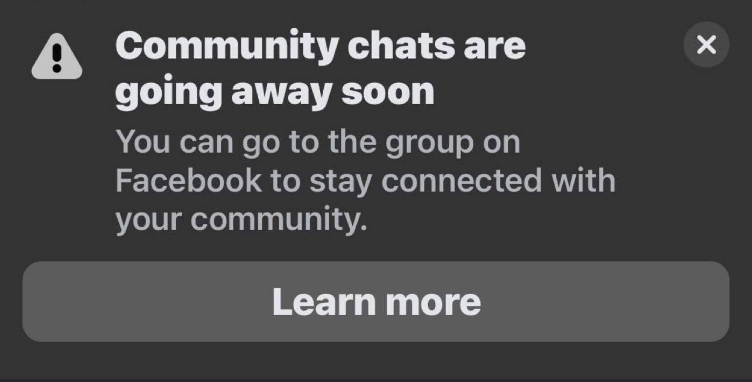 Facebook-н админуудад зориулсан Facebook группт саяхан гаргасан постоос харахад ийм төрлийн Community Chats in Facebook Groups-г идэвхгүй болгож байгааг бололтой...