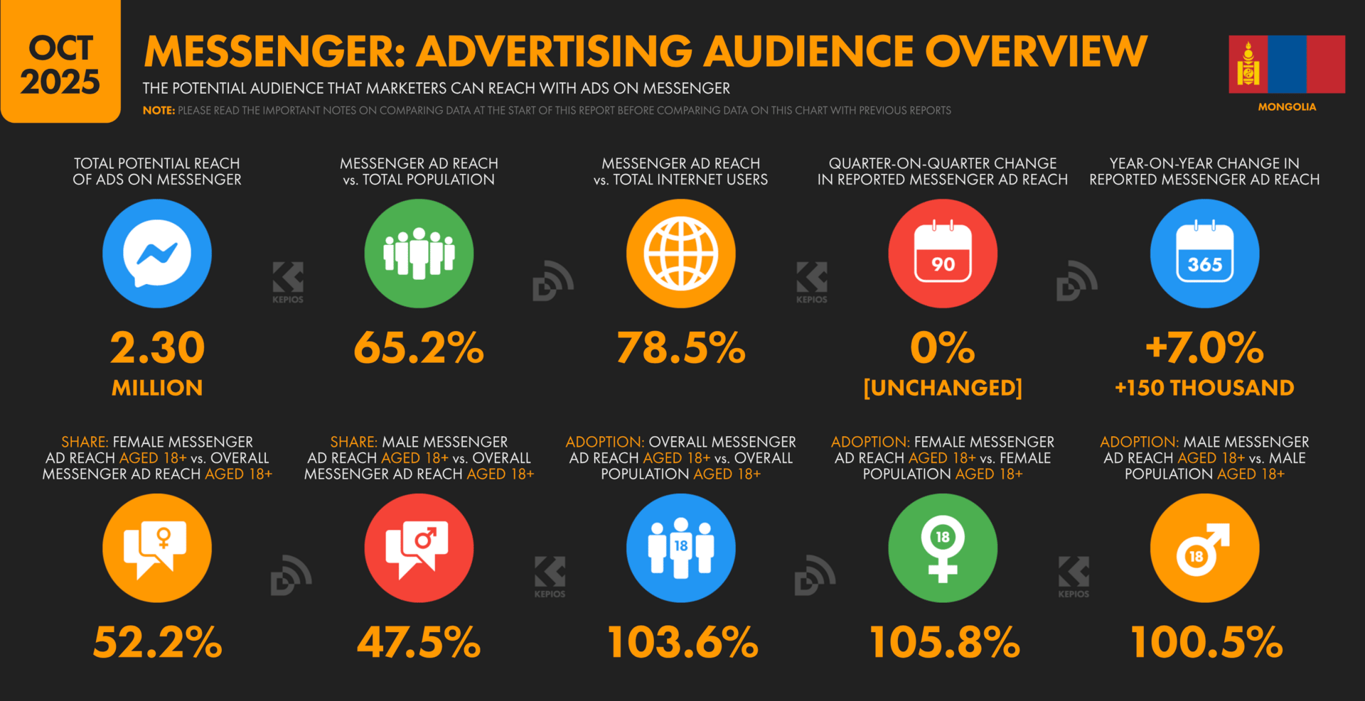 Мөн л Метагийн сурталчилгааны боломжит хүртээмжийн мэдээллээс харахад 2025 оны 10-р сар гэхэд Facebook messenger-н сурталчилгаа хүргэх боломжит хэрэглэгчдийн тоо Монголд 2.30 саяд хүрчээ. Эндээс Facebook messenger хэрэглэгчдийн тоо Монгол Улсын нийт хүн амын 65.2%-тай тэнцэж байгааг харж болно.