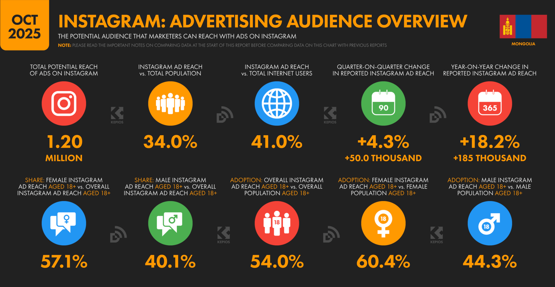 2024 оны 10-р сараас 2025 оны 10-р сарын хооронд Монгол дахь Instagram хэрэглэгчдийн тоо 185 мянгаар ( +18.2%) өссөн байна.