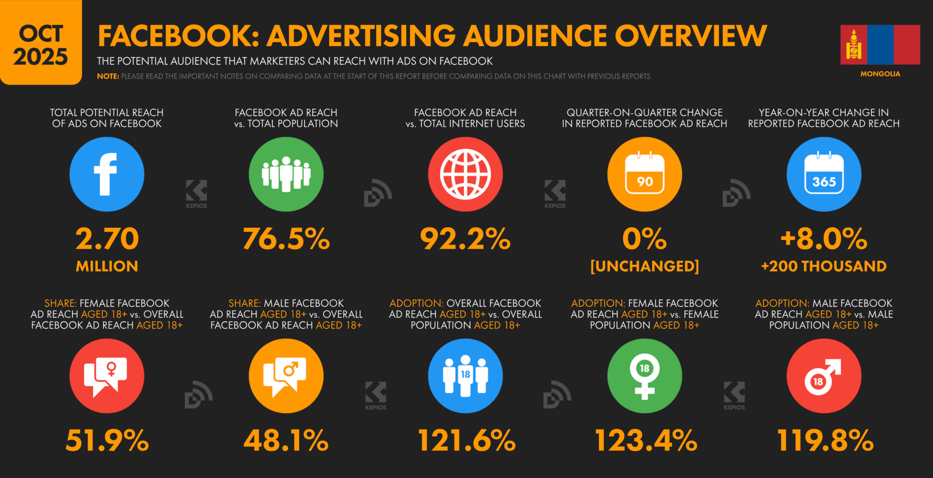 Энэ нь Facebook сурталчилгаа Монгол Улсын нийт хүн амын 76.5%-д хүрэх боломжтойг харуулж байна. Харин Мета төлбөртэй сурталчилгааг зөвхөн 13 ба түүнээс дээш насныханд хүргэдэг болохыг тооцож үзвэл Монгол Улсын 13 ба түүнээс дээш насны бүх хүнд 100% Facebook сурталчилгаа хүргэх боломжтой гэсэн үг.