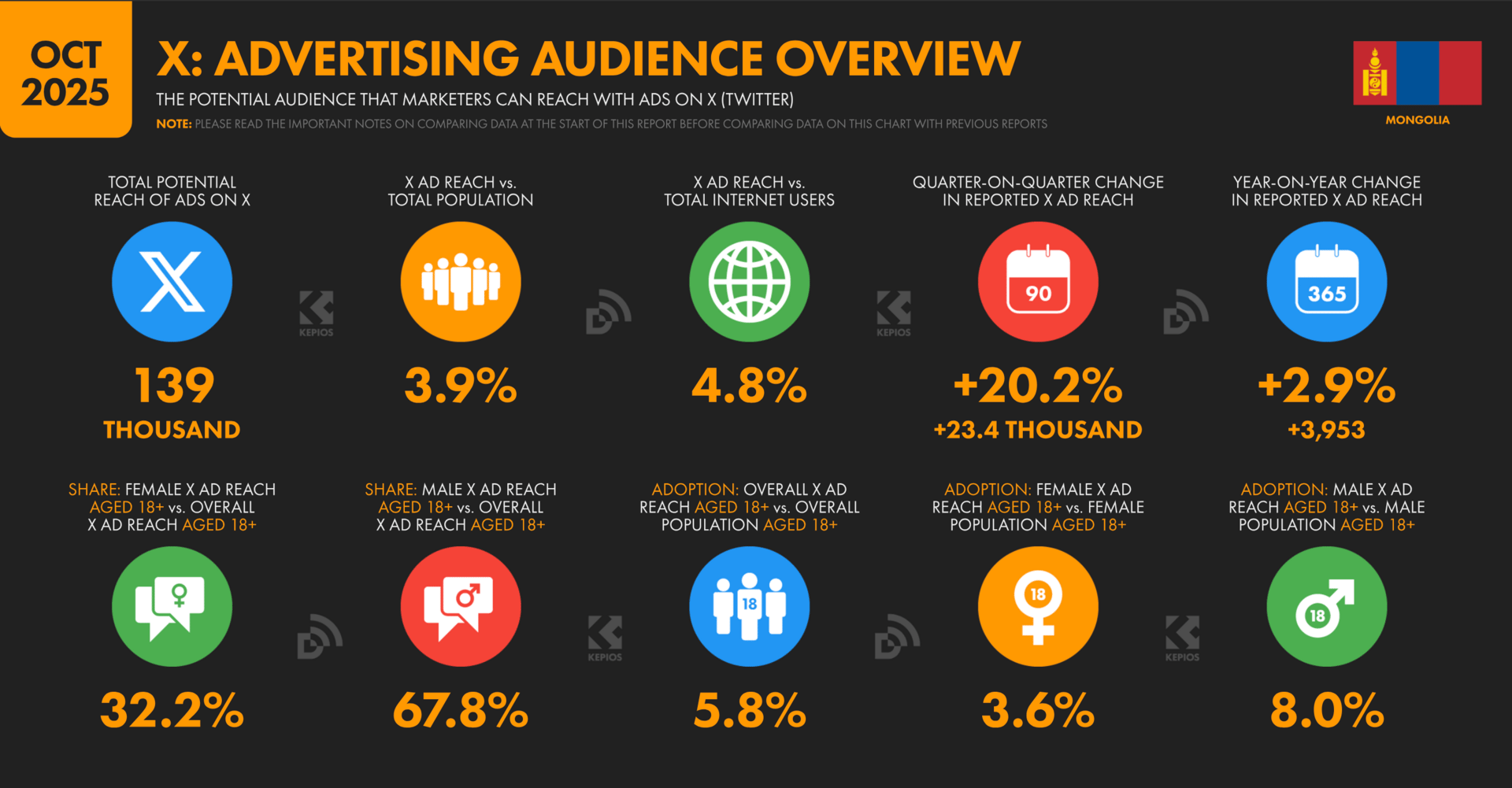 X (twitter)-н сурталчилгааны хүртээмжийн мэдээллээс харахад X хэрэглэгч Монголчуудын тоо 2025 оны 10-р сард нийт 139.0 мянга болжээ. Энэ нь Х-ийн хэрэглэгчид Монгол Улсын нийт хүн амын 3.9%-тай тэнцэж байна гэсэн үг.